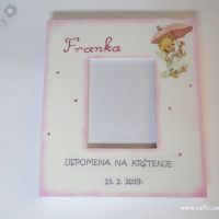 Okvir je dimenzije 20x23 cm. Otvor za sliku je oko 8x11 cm. Okvir se može držati na stolu / polici ili objesiti na zid. Možete izabrati neki od ponuđenih tekstova ili tekst po želji uz nadoplatu.